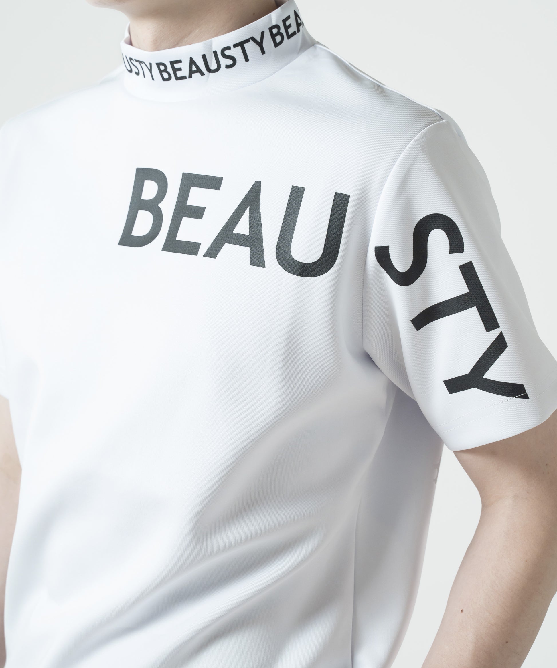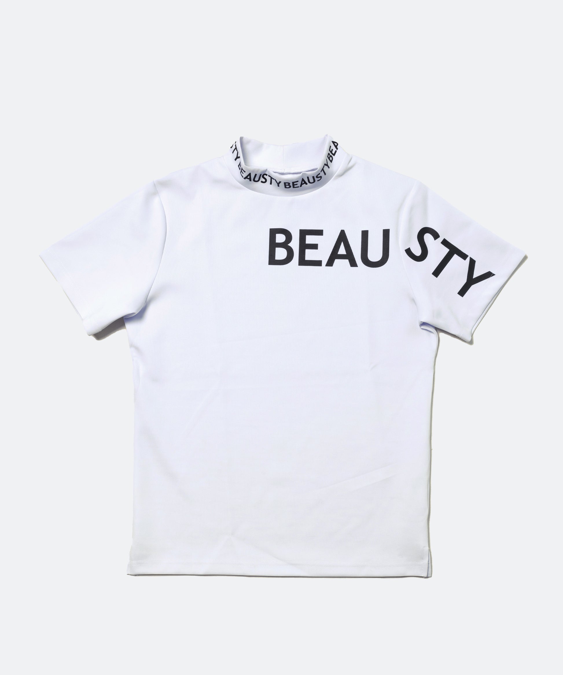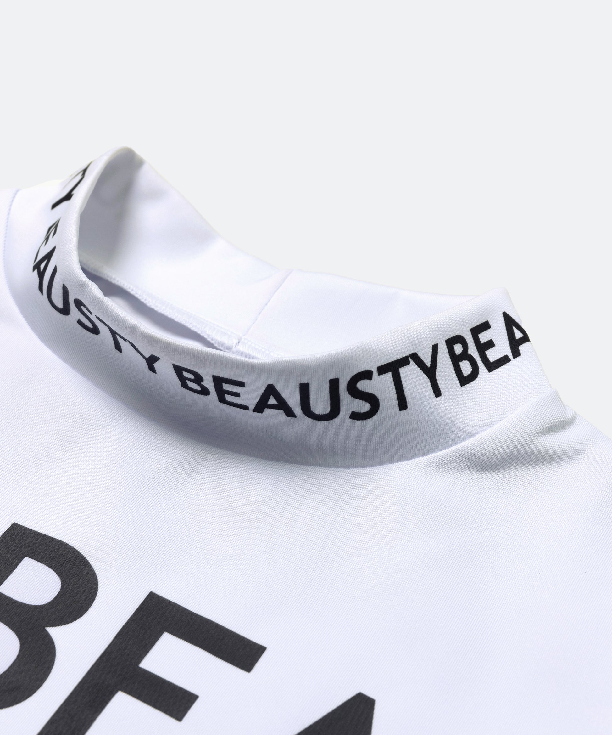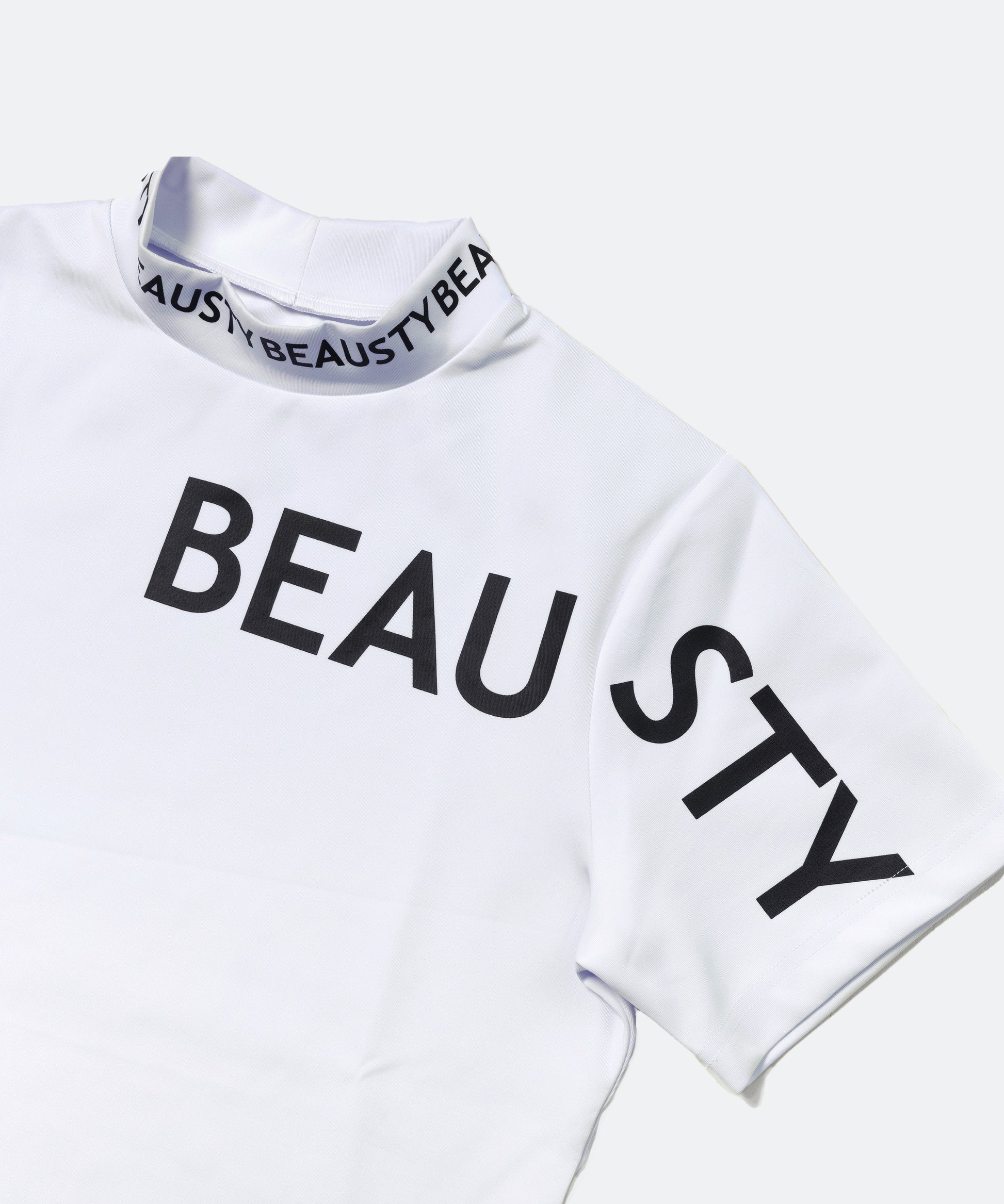 前面にBEAUSTYのアシンメトリーなロゴが配置されたこのモックネックTシャツは、斬新なスタイルをゴルフウェアにもたらします。