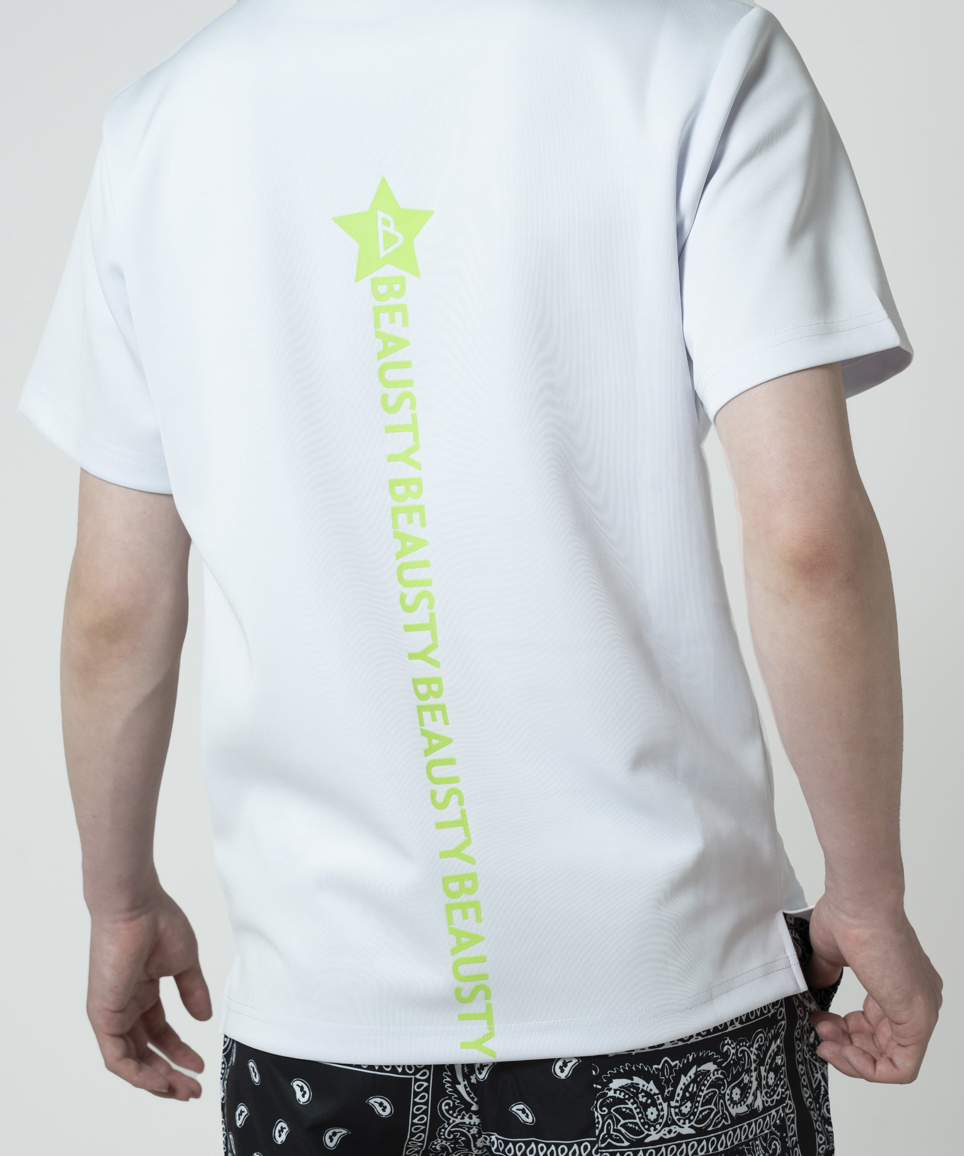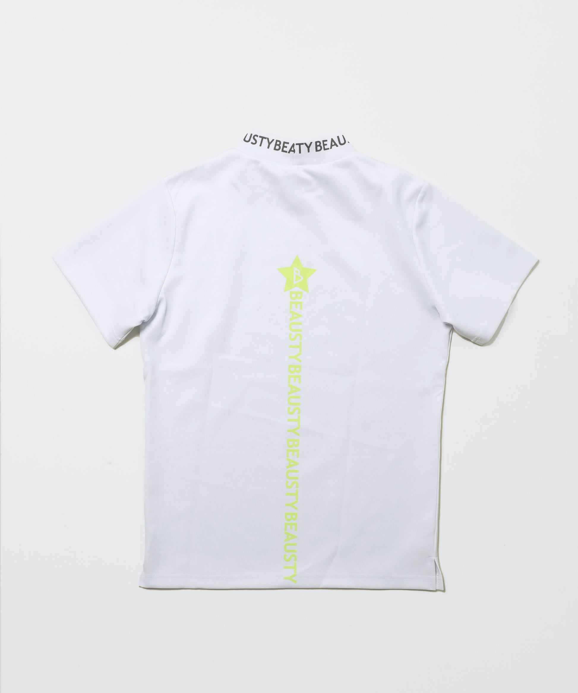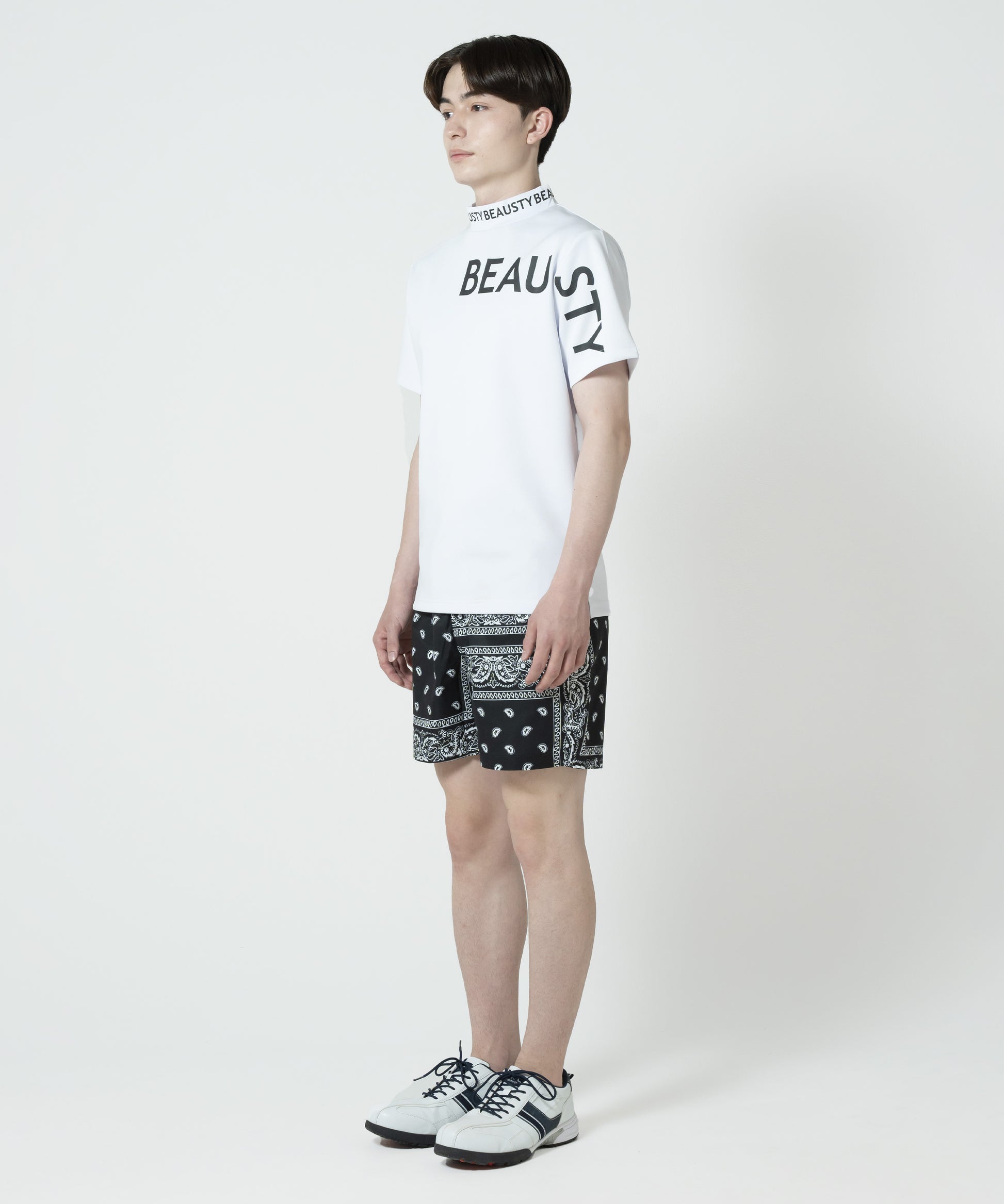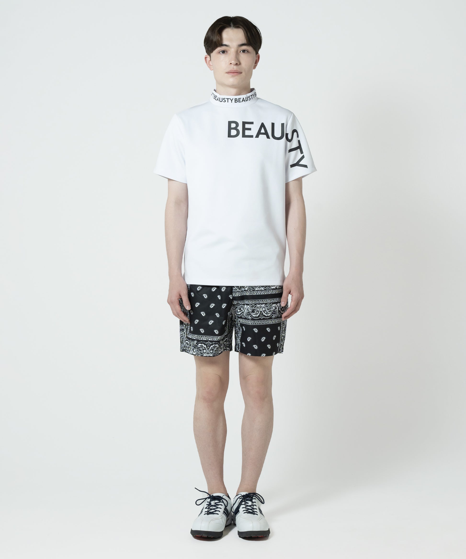 前面にBEAUSTYのアシンメトリーなロゴが配置されたこのモックネックTシャツは、斬新なスタイルをゴルフウェアにもたらします。