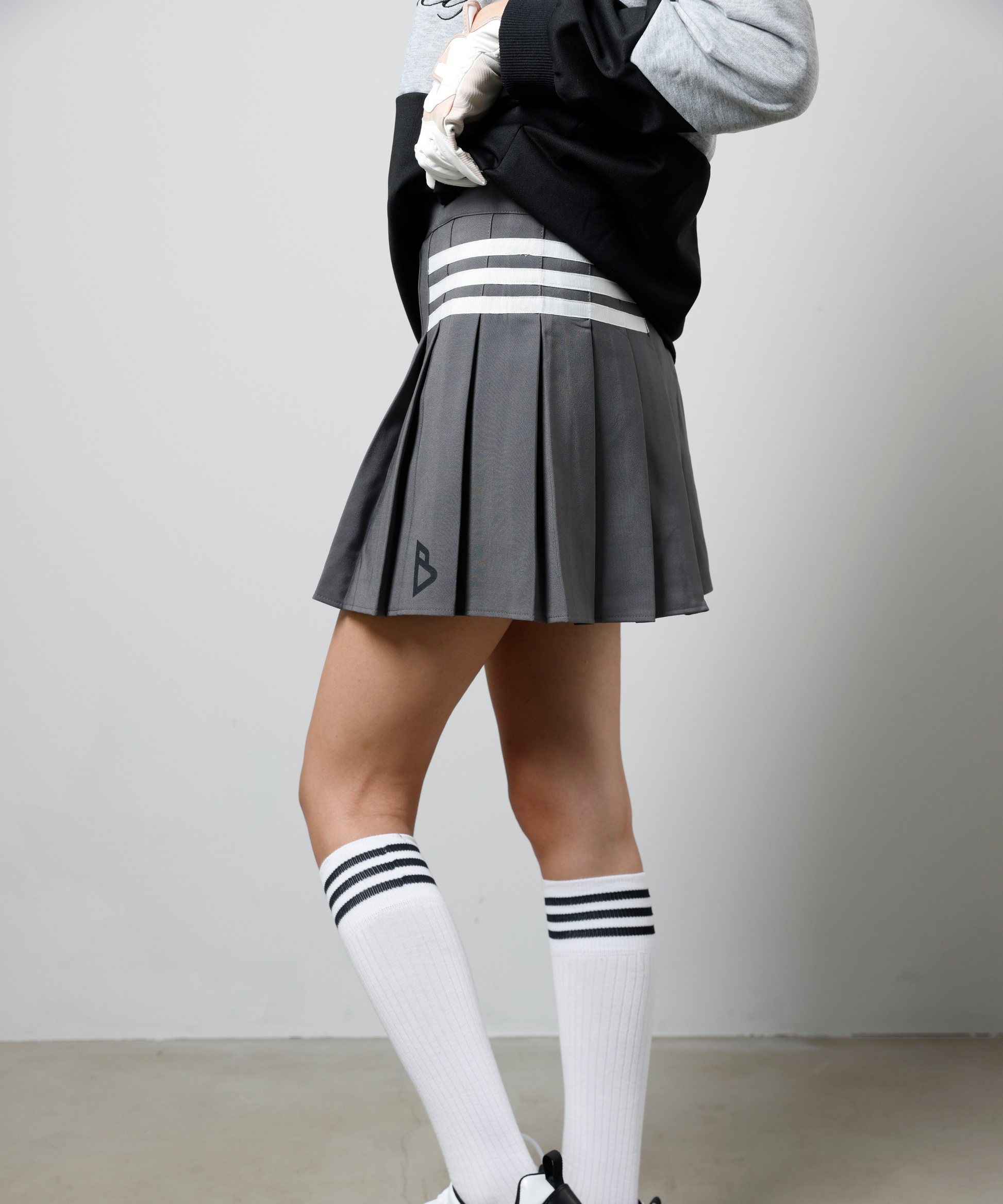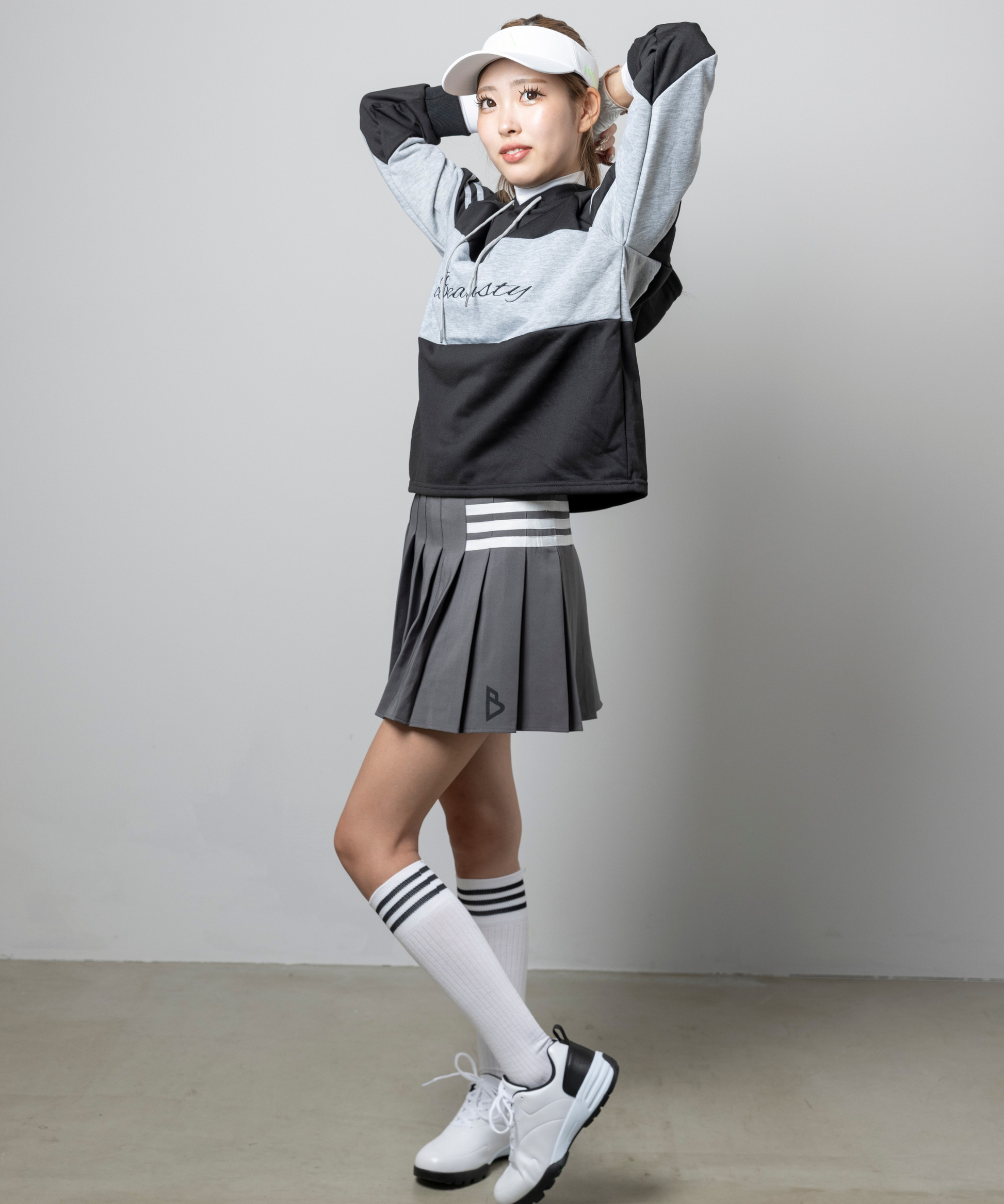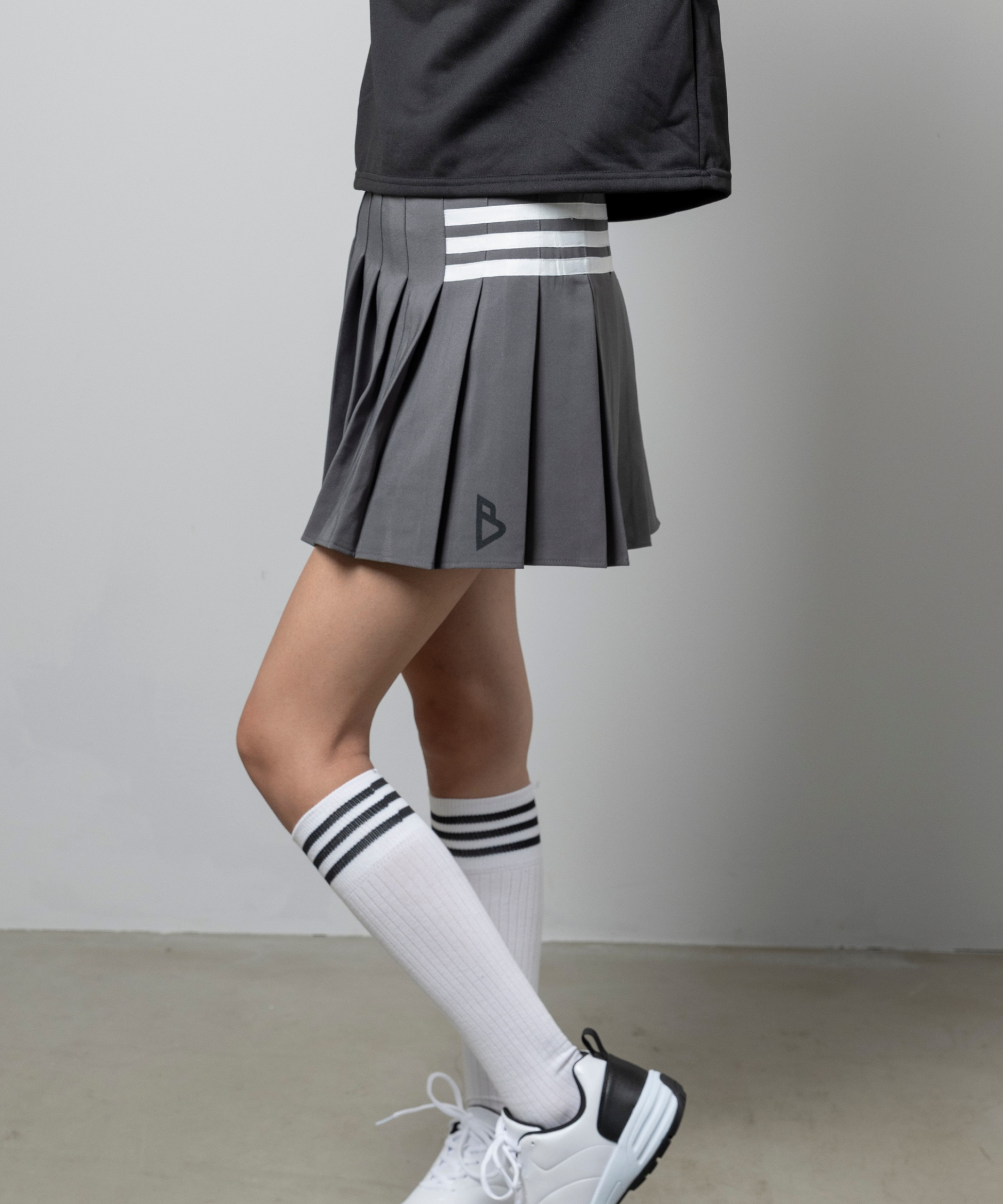 クラシックなデザインにモダンなタッチを加えた、スタイリッシュなゴルフウェアです。 特徴的なストライプがアクセントになりながら、サイドには控えめなBロゴがブランドの象徴をさりげなく表現しています。 伸縮性のあるウエストバンドは全ての動きに対応し、快適なフィット感を提供します。 このプリーツスカートは、動きやすさとファッション性を両立させたい女性ゴルファーにぴったりです。