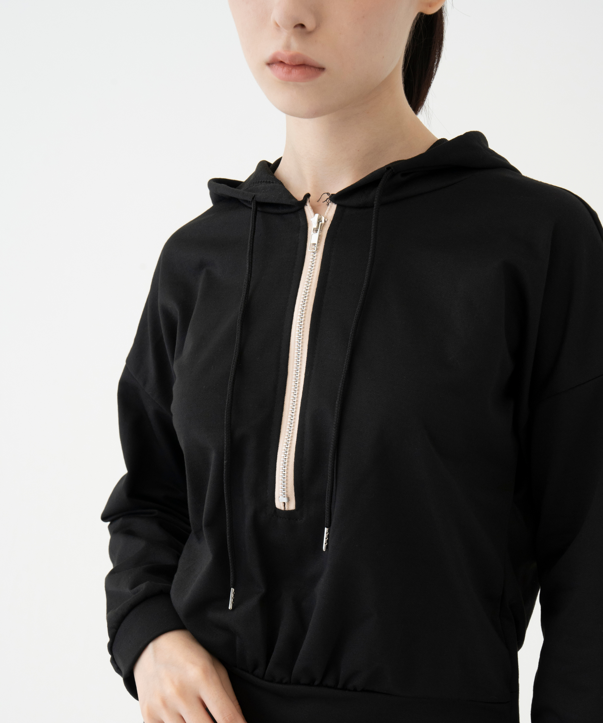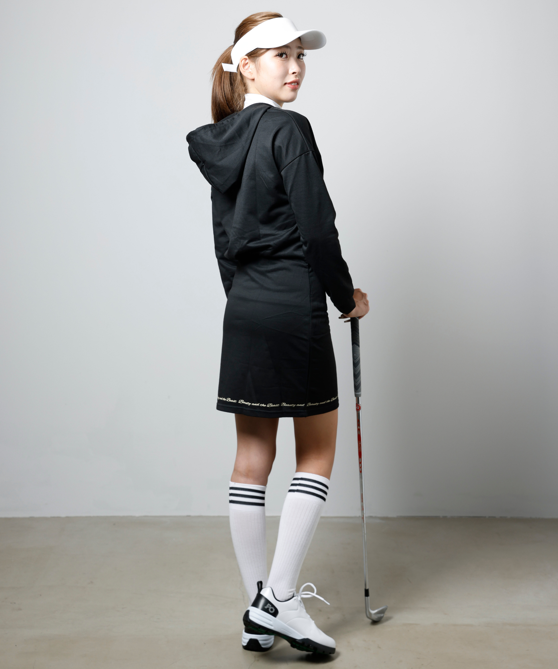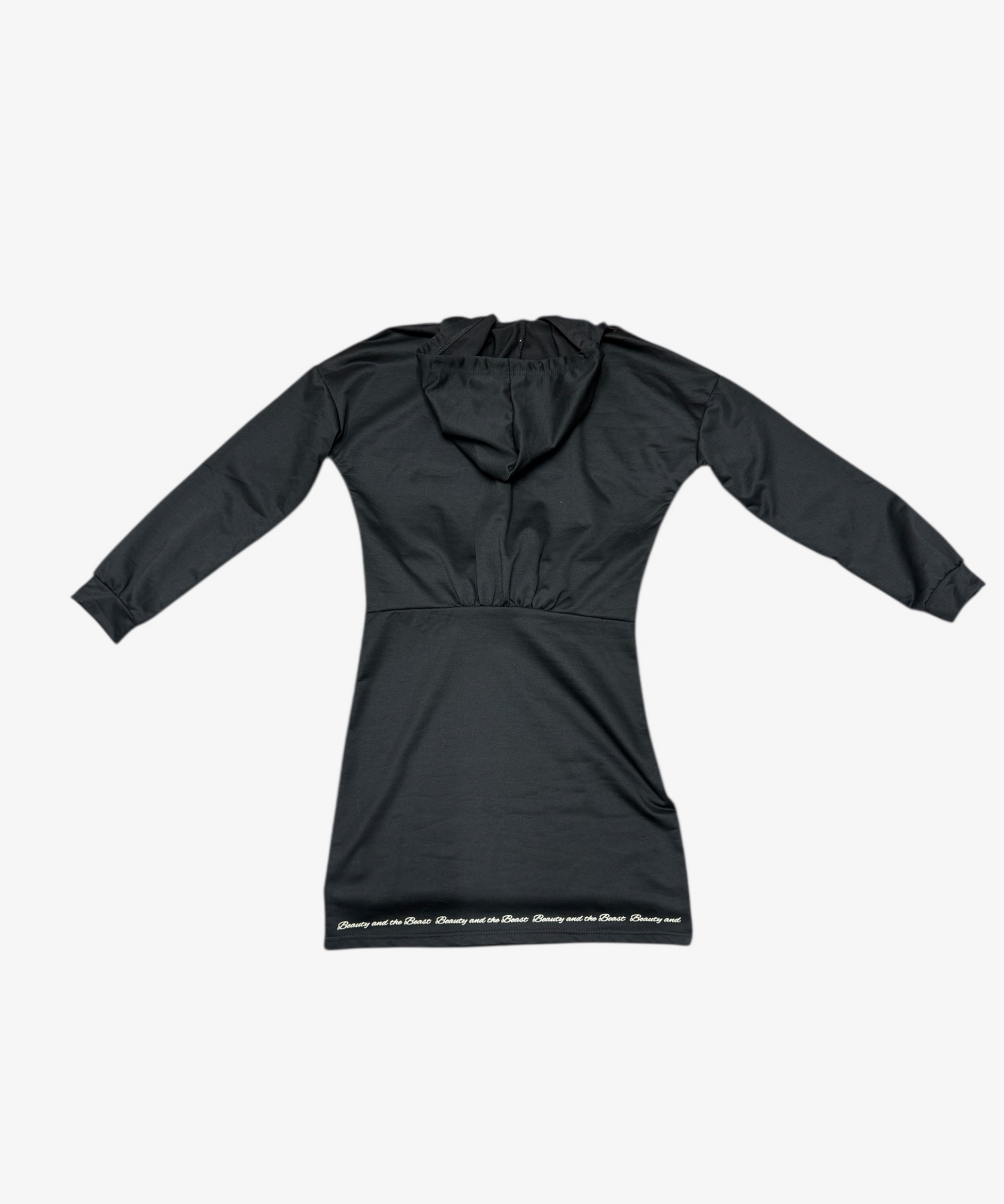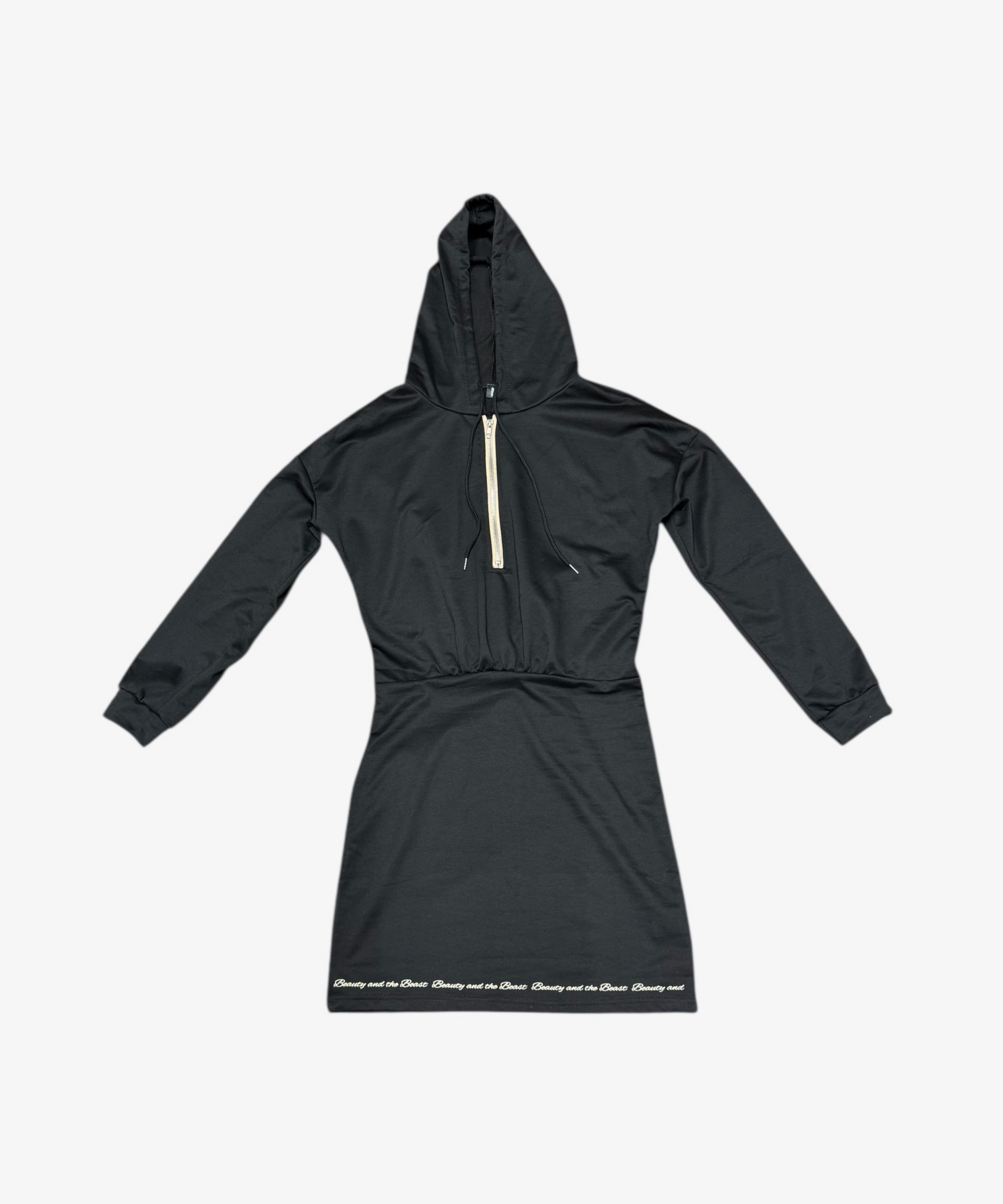 フード付きデザインでスポーティな雰囲気を演出する、長袖タイトワンピース。前立てにはファスナーが施されており、開閉によって首元のデザインを自由に変えられるのが魅力です。スカートには「Beauty and the Beast」ロゴが施されており、さりげなくブランドの存在感をプラス。ボディラインに沿ったタイトシルエットが女性らしさを引き立てながら、カジュアルにもスタイリッシュにも着こなせるアイテムです。